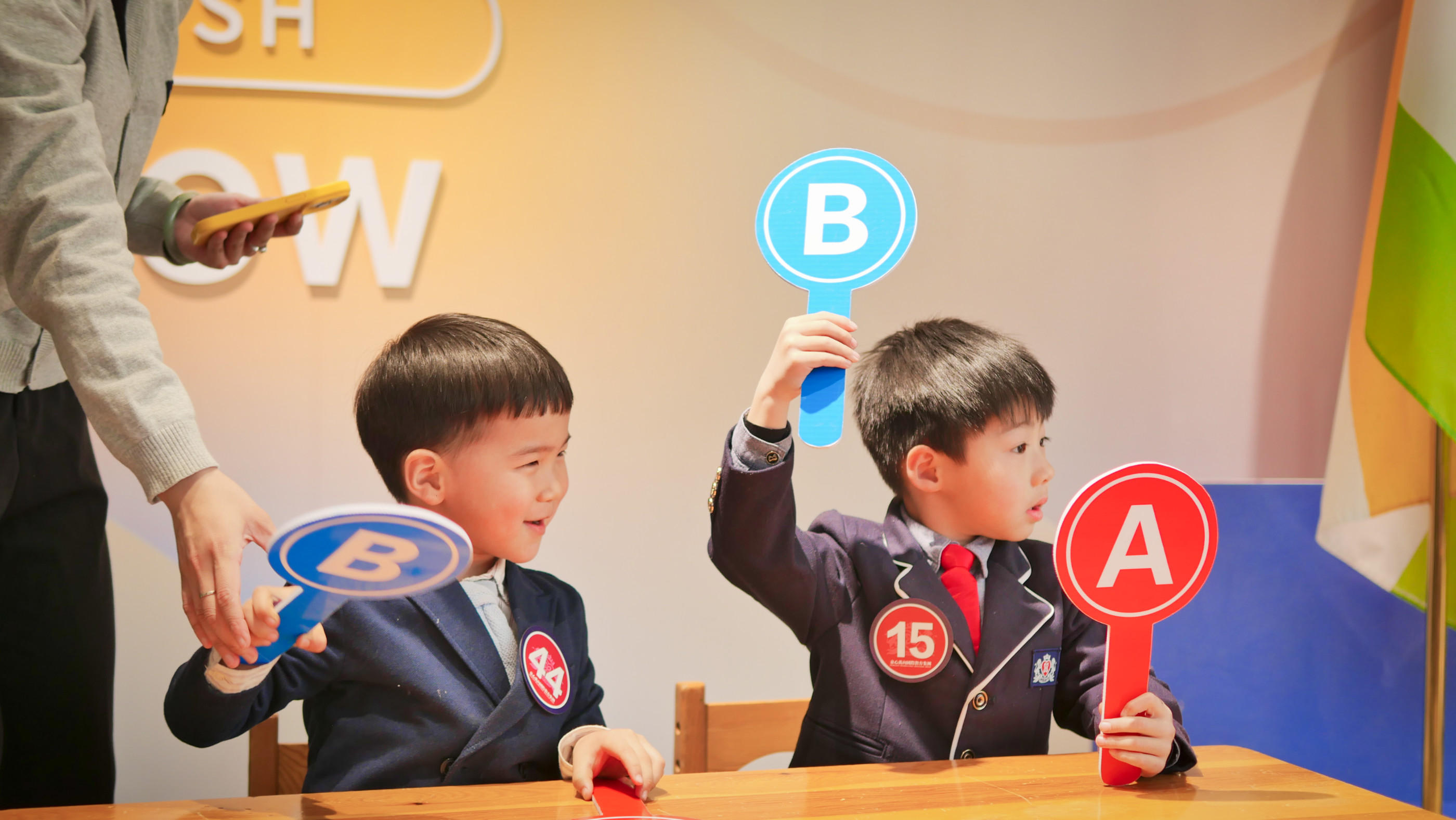 这是一轮孩子们与A、B、C“和谐相处”的环节,指导老师现场读题,孩子们举牌完成作答。